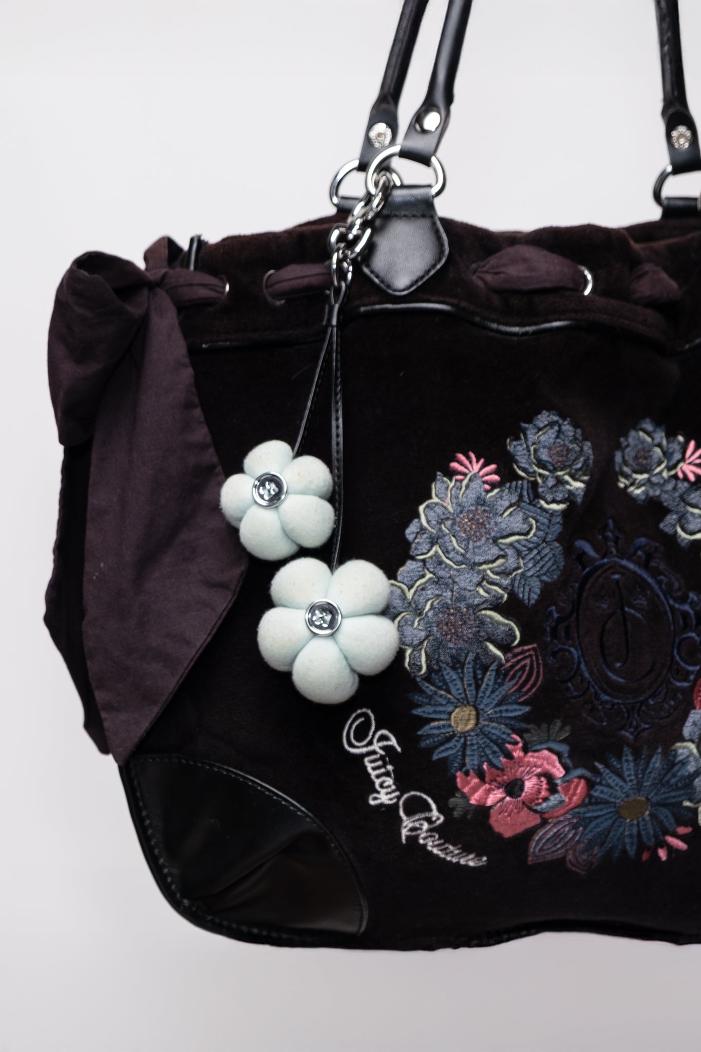 Vintage Juicy Couture velour handbag with embroidered floral crest and soft ruched top. Finished with faux-leather trim, double handles, and a OG puffy flower charm detail for peak Y2K vibes.