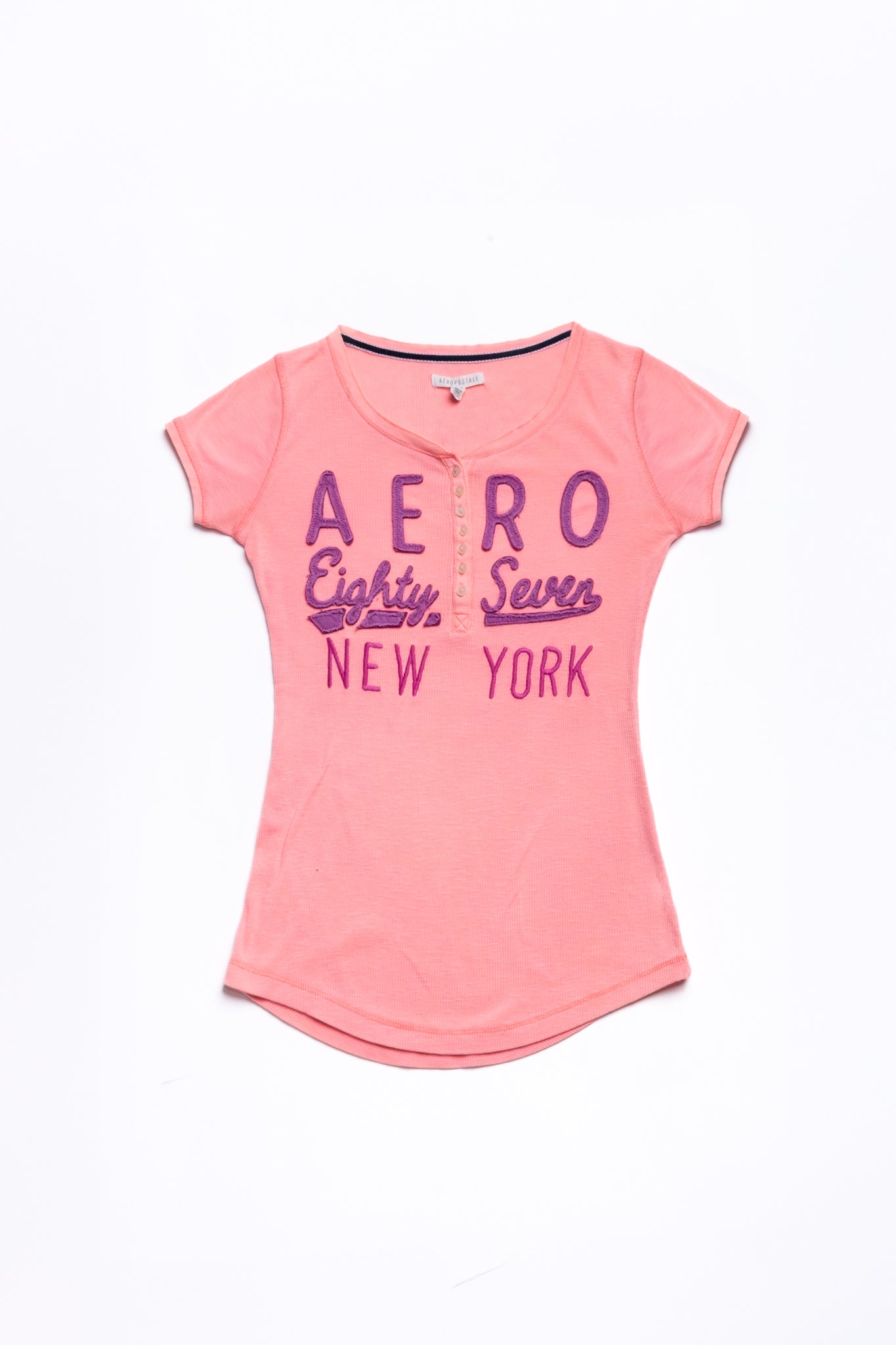 2010s Aeropostale henley baby tee in a soft candy-pink ribbed knit with raised logo embroidery and button front. Fitted, stretchy, and made for low-rise denim days and easy layering.
