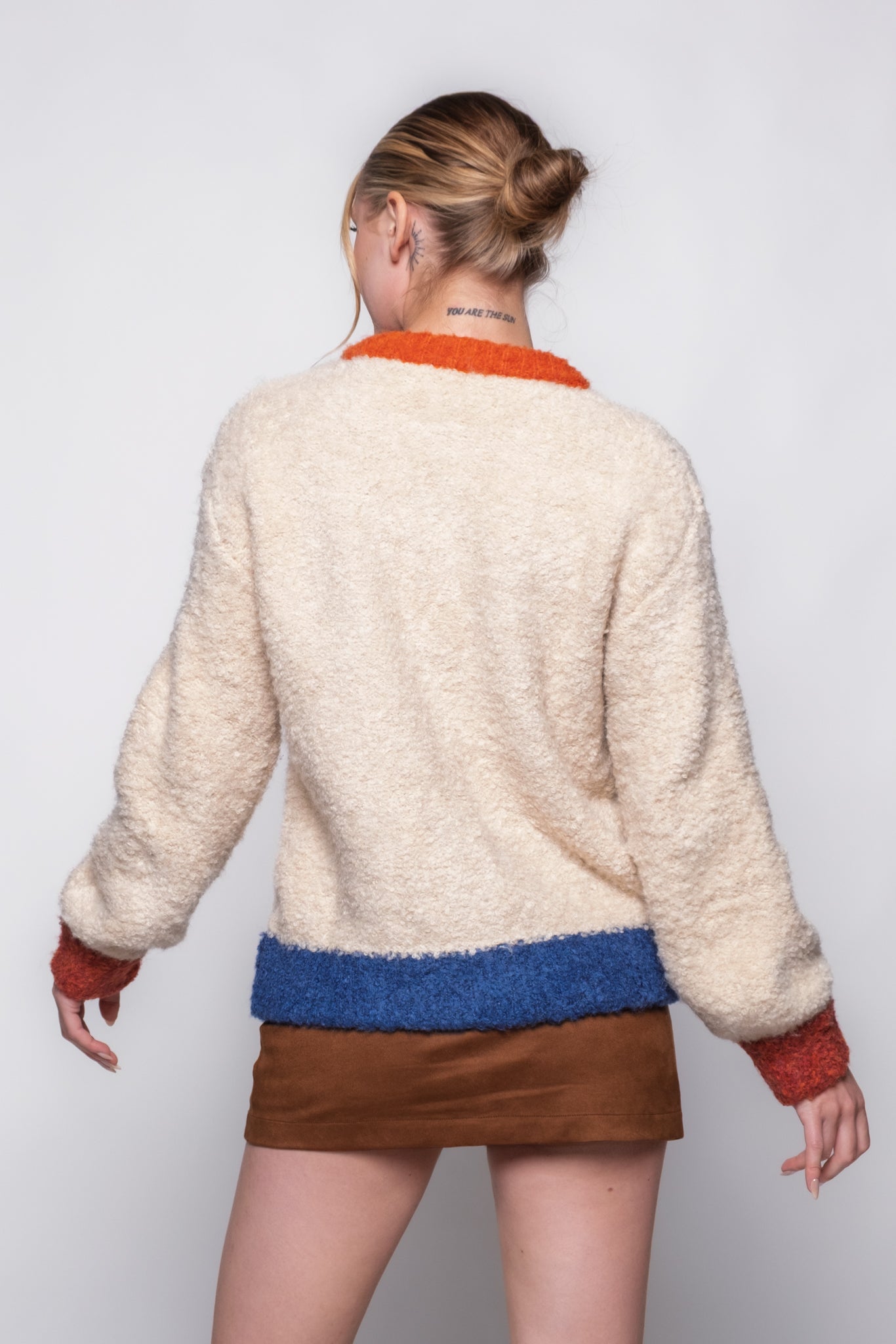 The FRNCH Cyclamen Crewneck Cardigan features a soft boucle knit with bold colorblock trim and tortoiseshell buttons. Its relaxed fit and cozy texture make it an easy statement layer for cooler days.