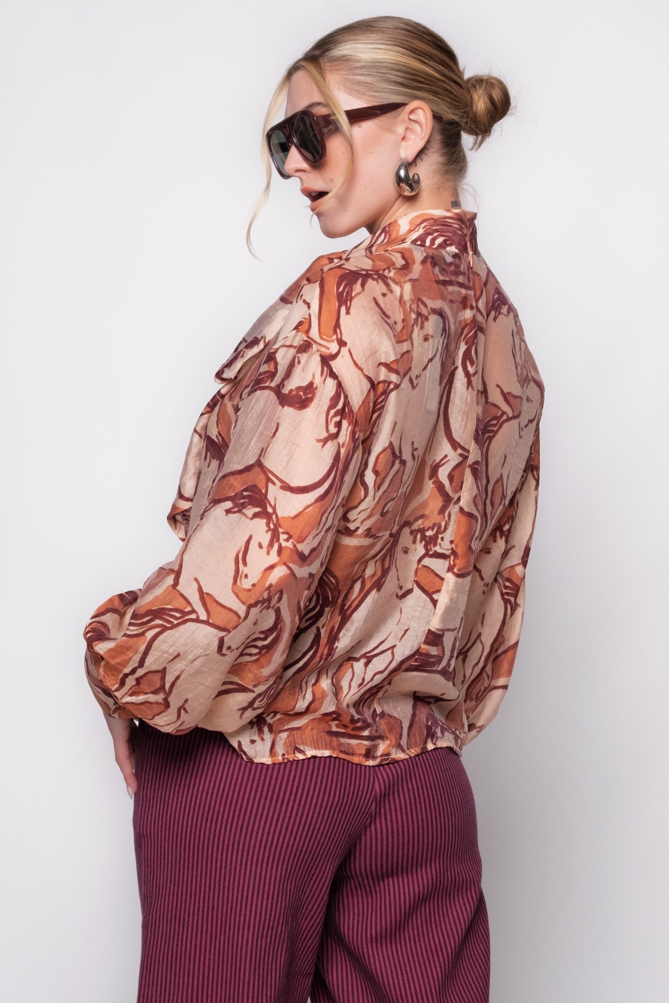 The Steve Madden Sutton Top features a flowing silhouette with a statement neck tie and painterly horse print. Lightweight and sheer with subtle volume through the sleeves, it brings an artful, romantic edge to any look.