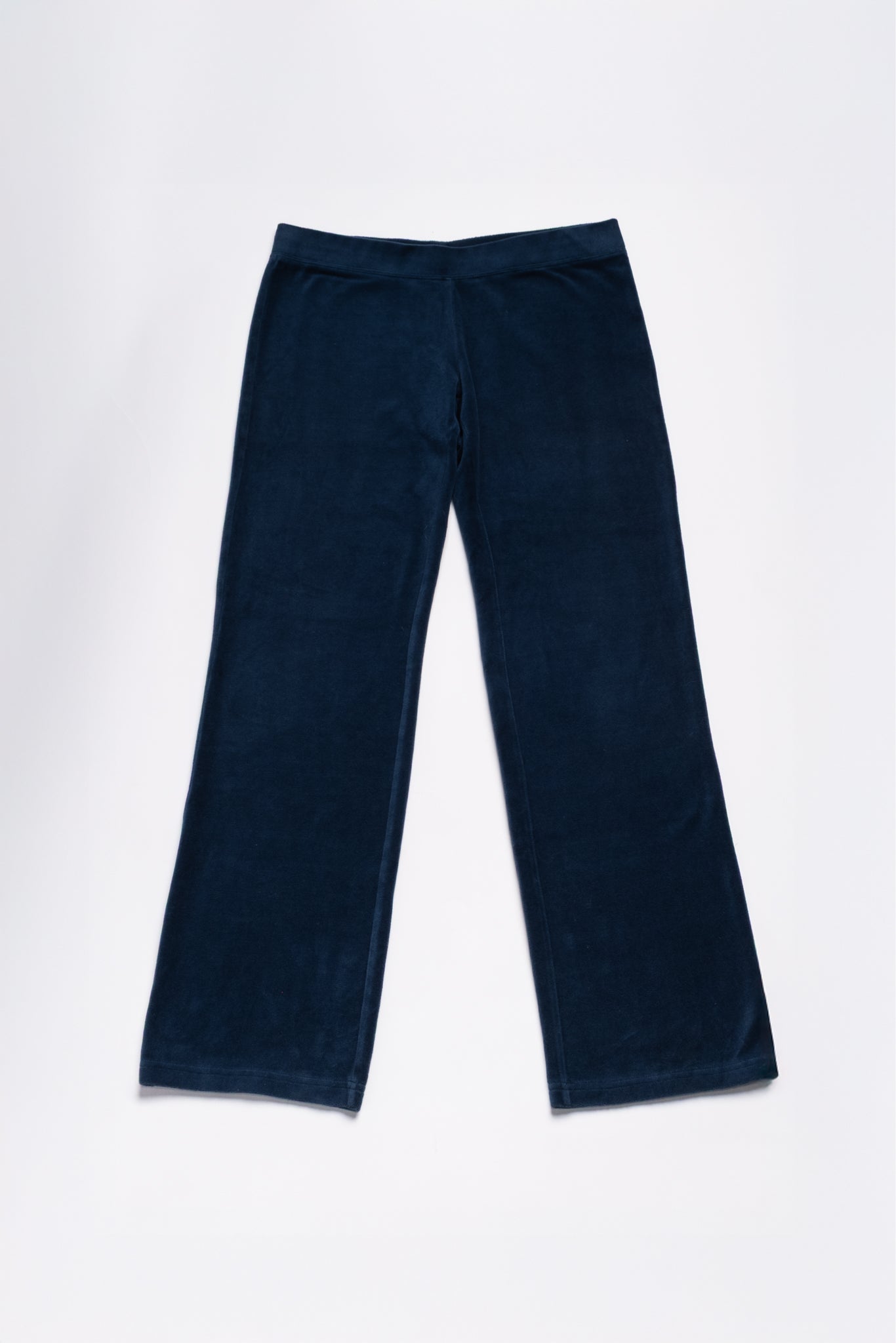 Vintage Style & Co velour lounge pants in a rich navy blue with a soft plush finish and relaxed straight-leg fit. Pull-on style with a smooth waistband for easy, comfy wear.