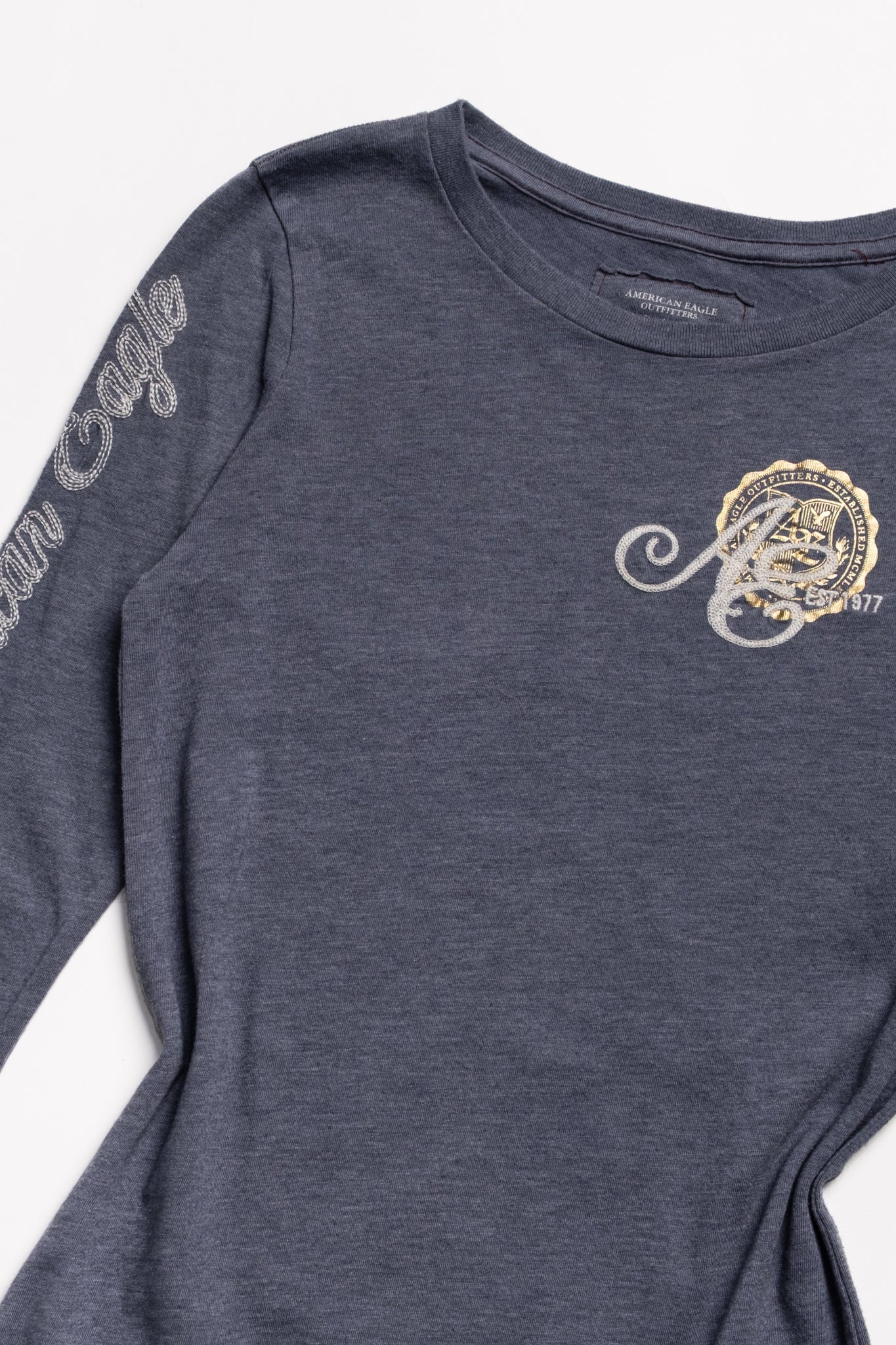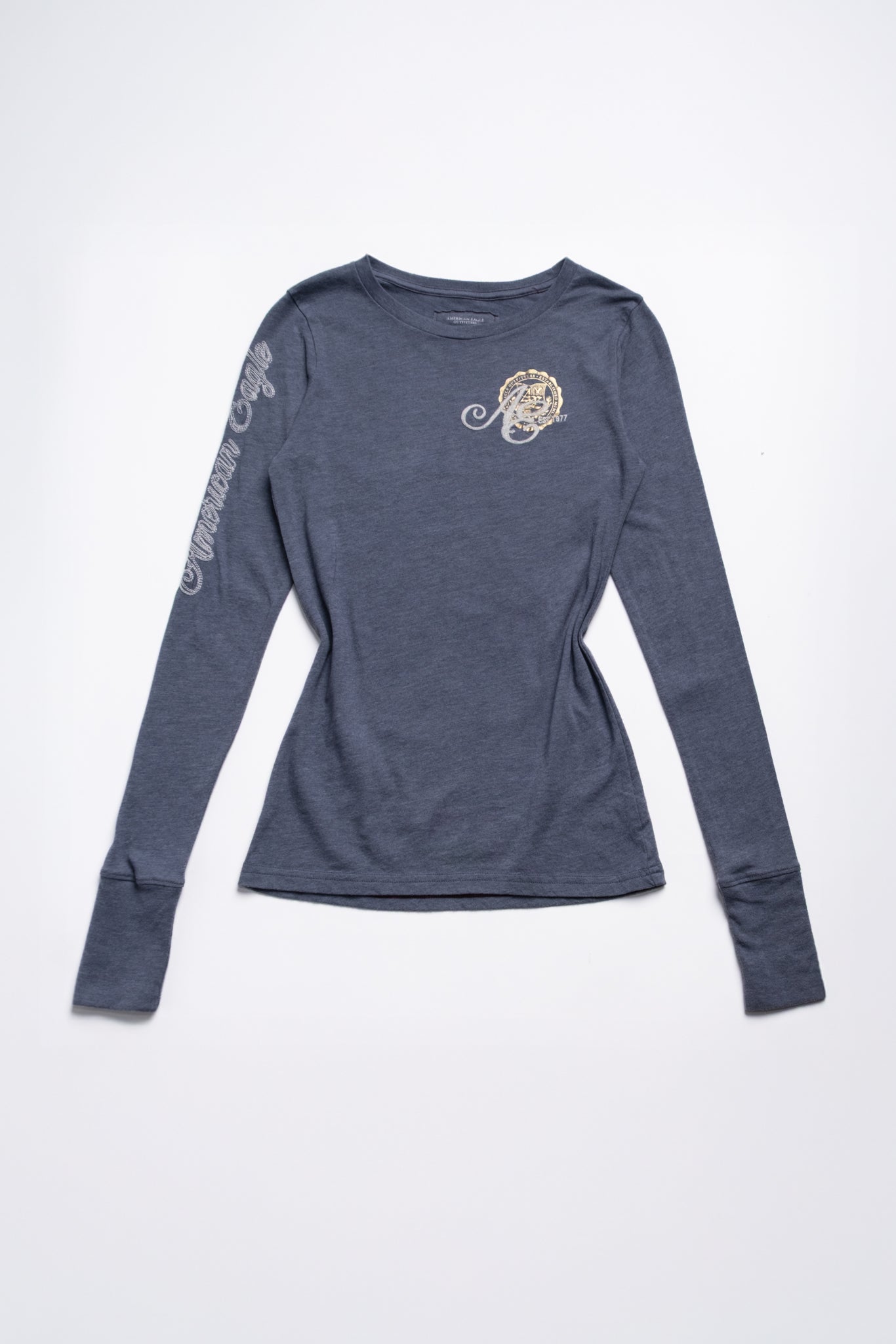 Vintage Y2K American Eagle long sleeve tee in a soft heathered charcoal with embroidered chest detail and sleeve. Slim, stretchy fit with ribbed cuffs—perfect for layering or wearing solo with denim.