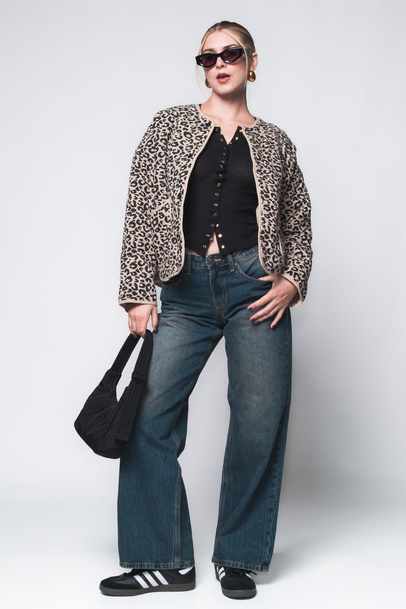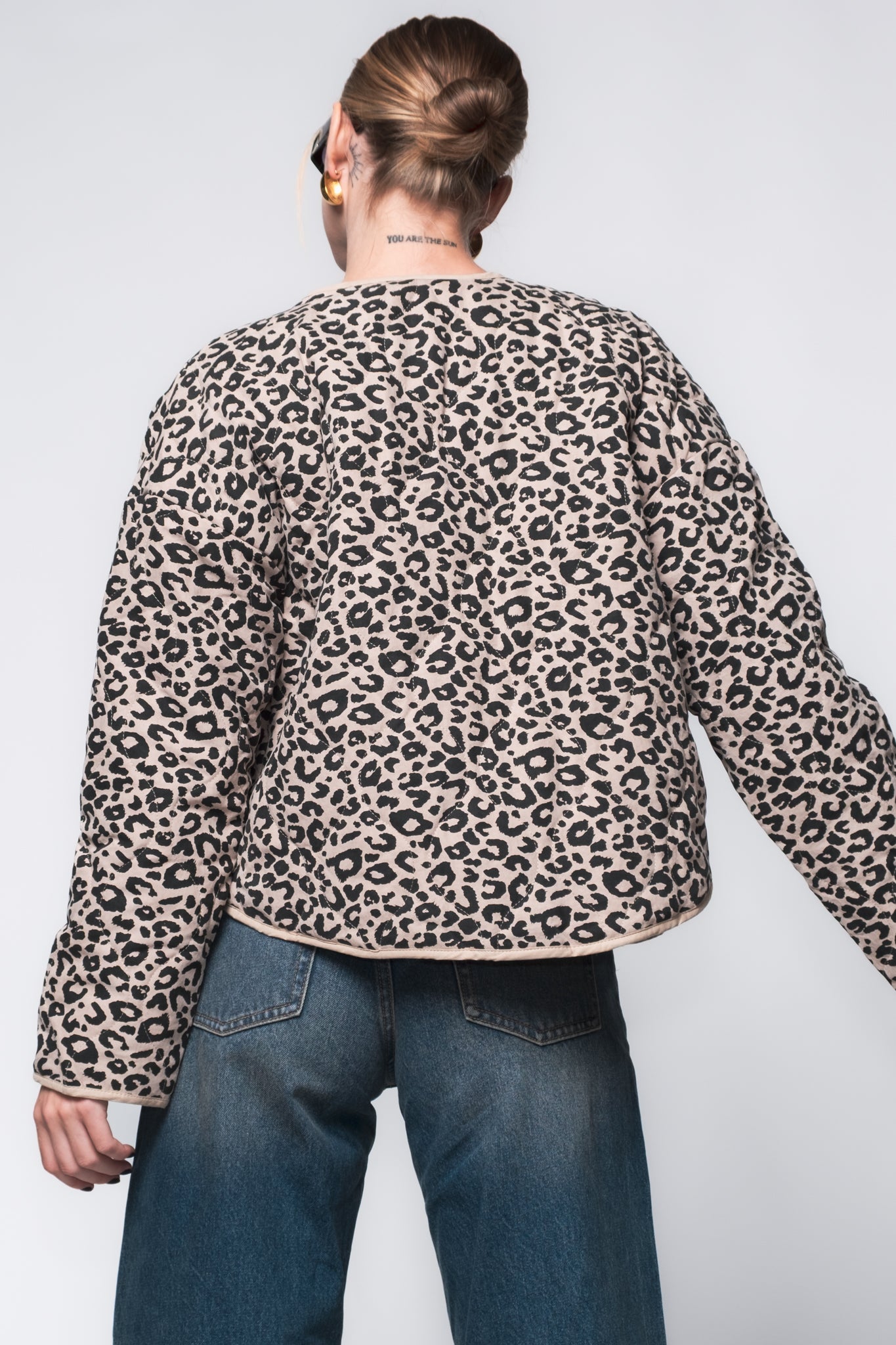 Meet your new go-to layer. This lightweight quilted jacket comes in a chic leopard print that gives neutral, but not boring. Cut in a relaxed, boxy fit with bound edges and front patch pockets, it's the kind of jacket that instantly pulls your look together!