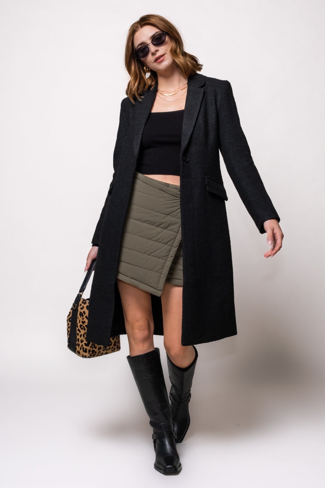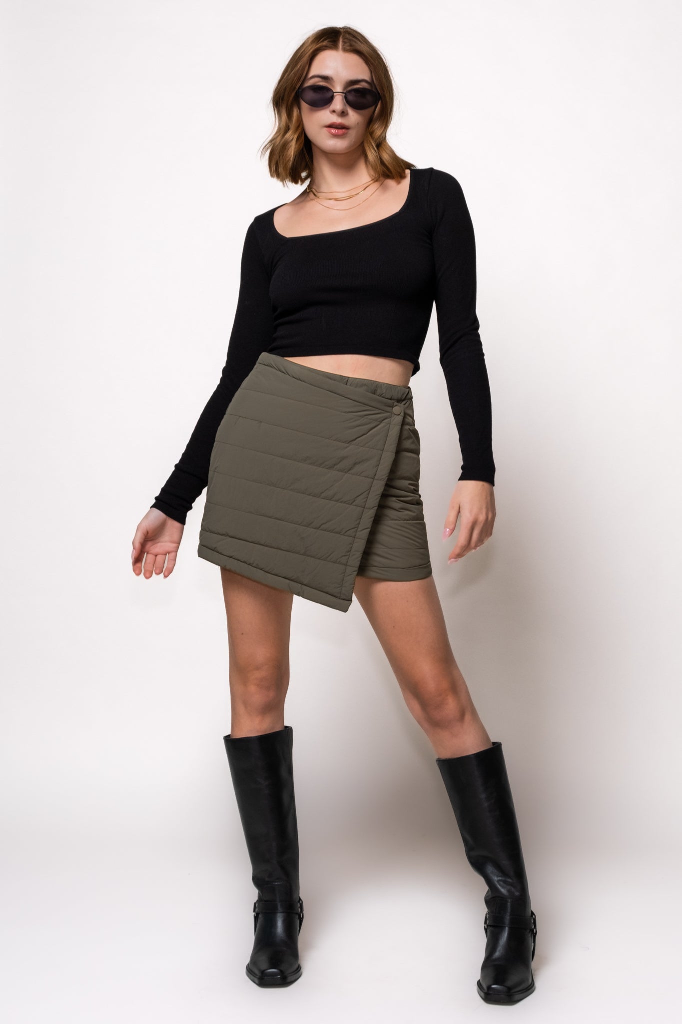 This super cute mini skirt features a highwaist fit and snap closure in front! Inspired by your comfiest fall jacket, this quilted mini is the perfect fall staple to pair with your tall boots and a cozy cropped sweater or fitted turtleneck top!