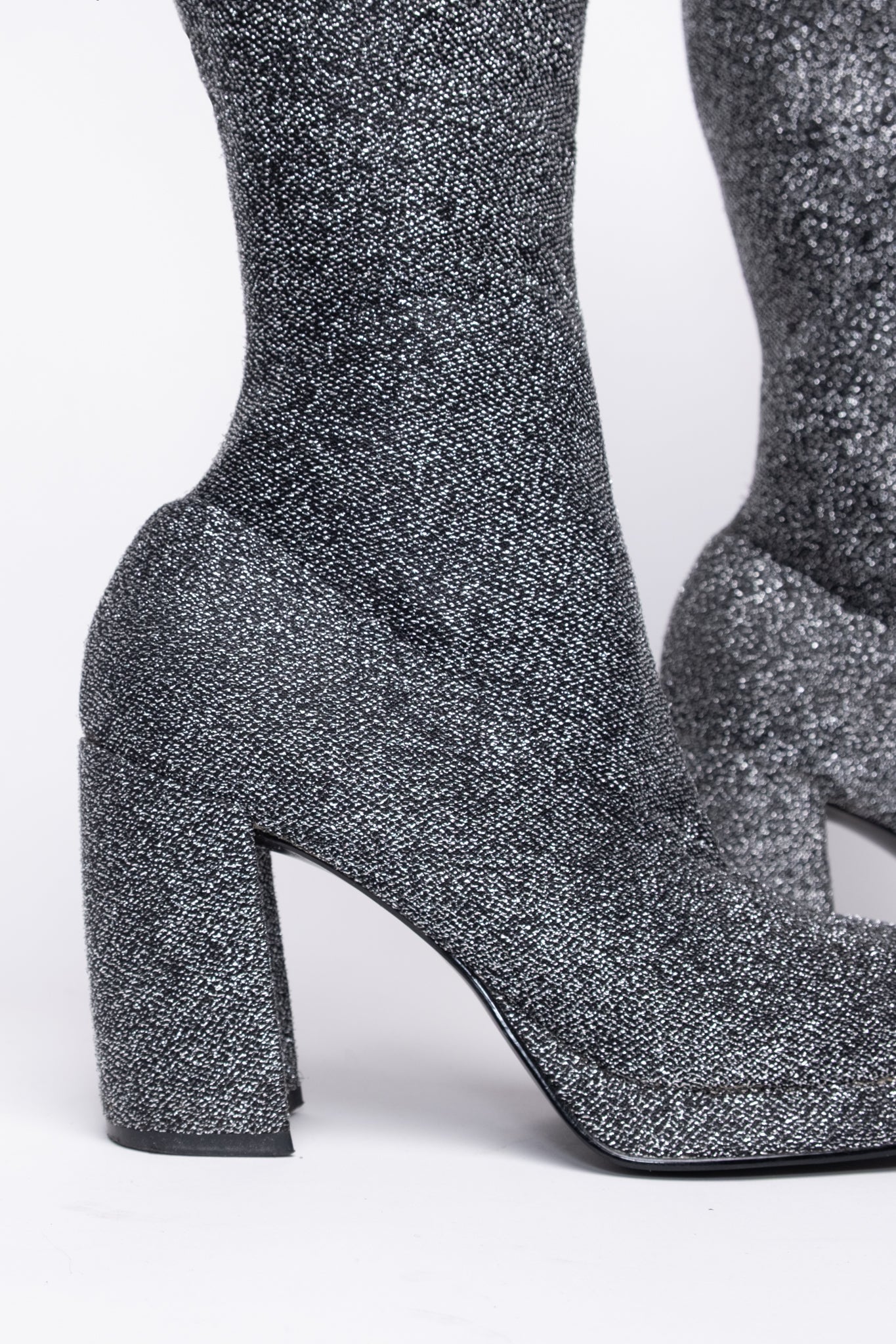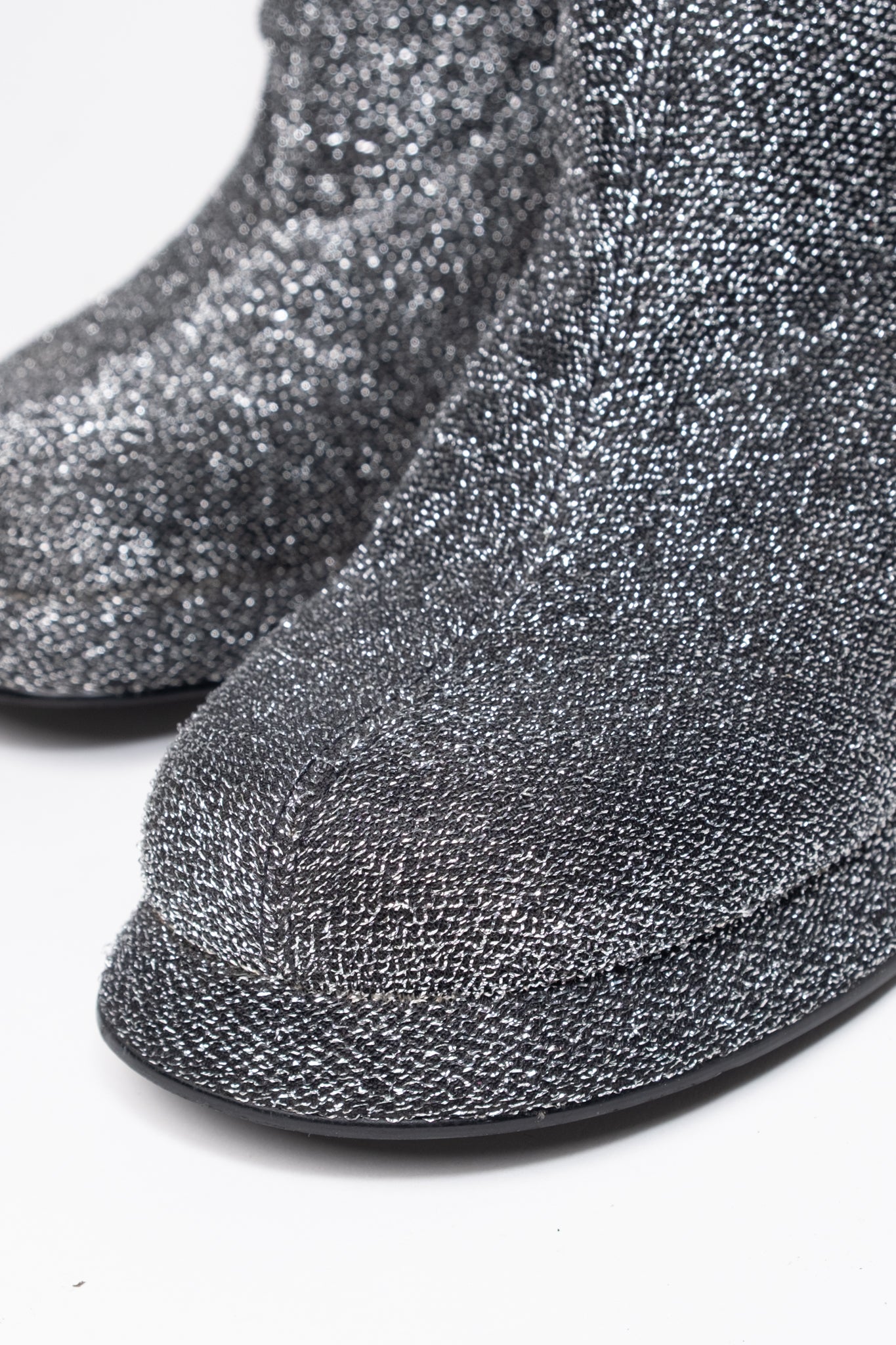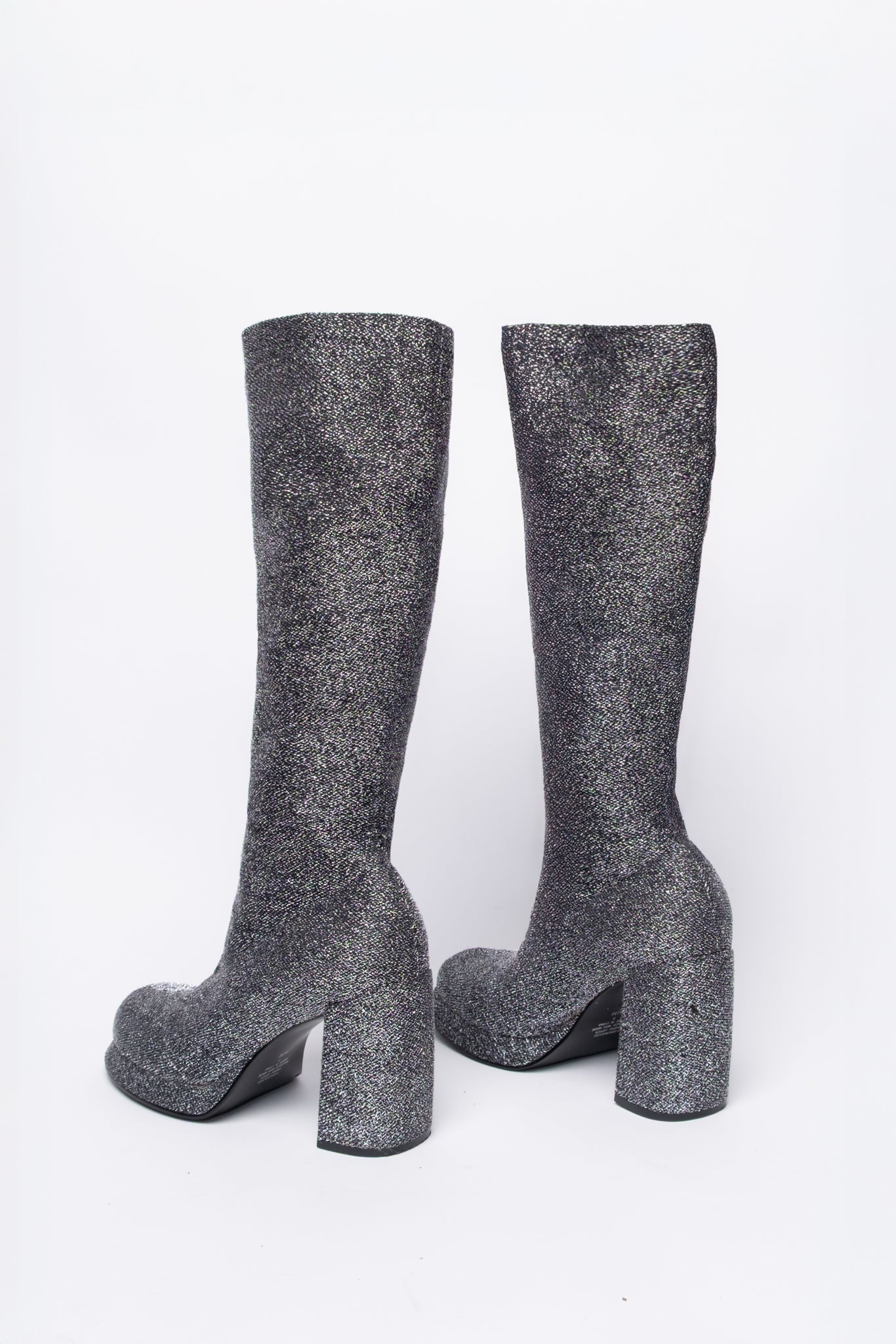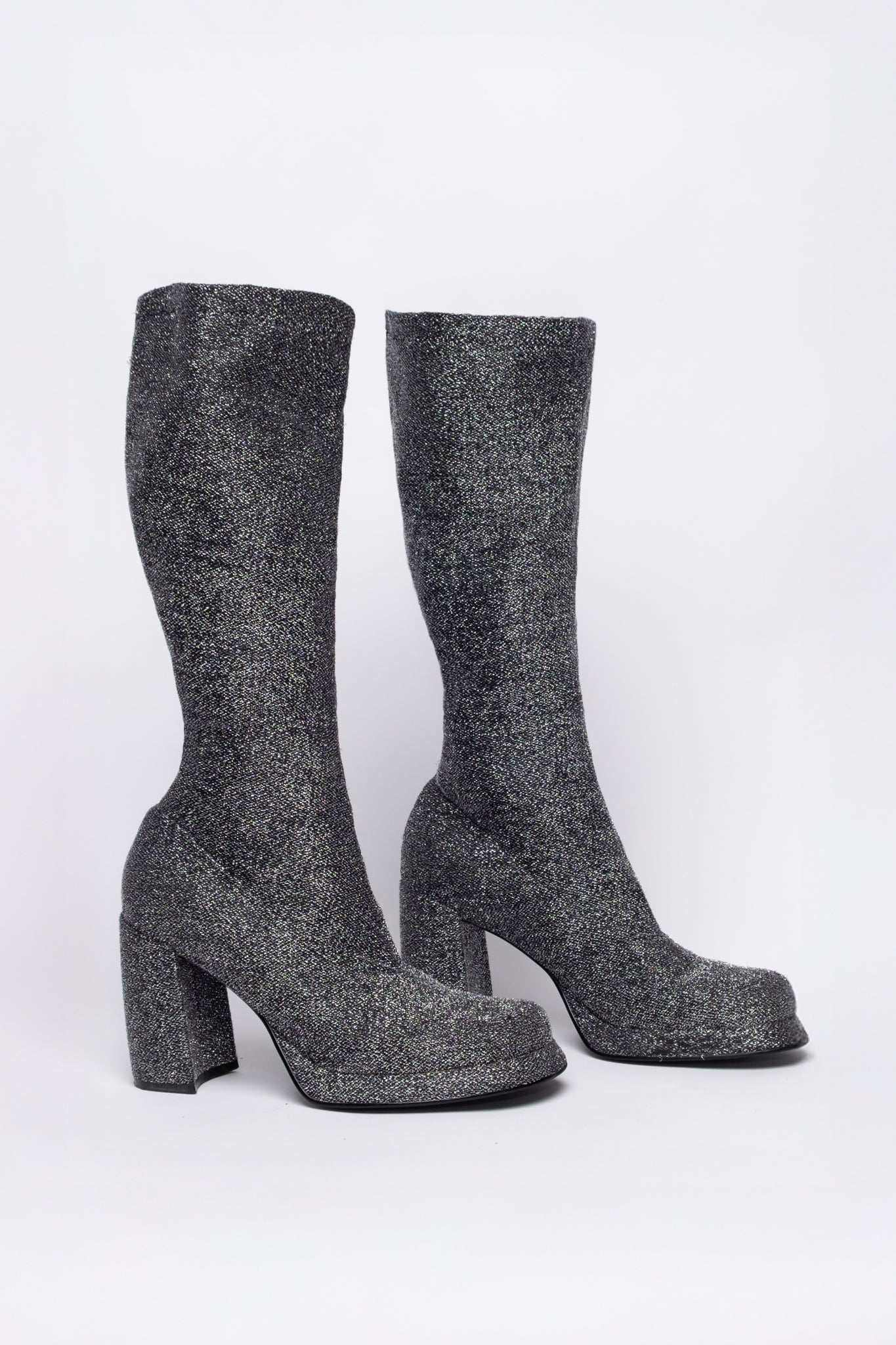 A standout late-’90s statement boot in near-mint condition! These 9&co boots feature a shimmering silver-black knit fabric, rounded toe, and chunky platform with a sturdy block heel giving them that iconic turn-of-the-millennium silhouette. Hello, Scary Spice?