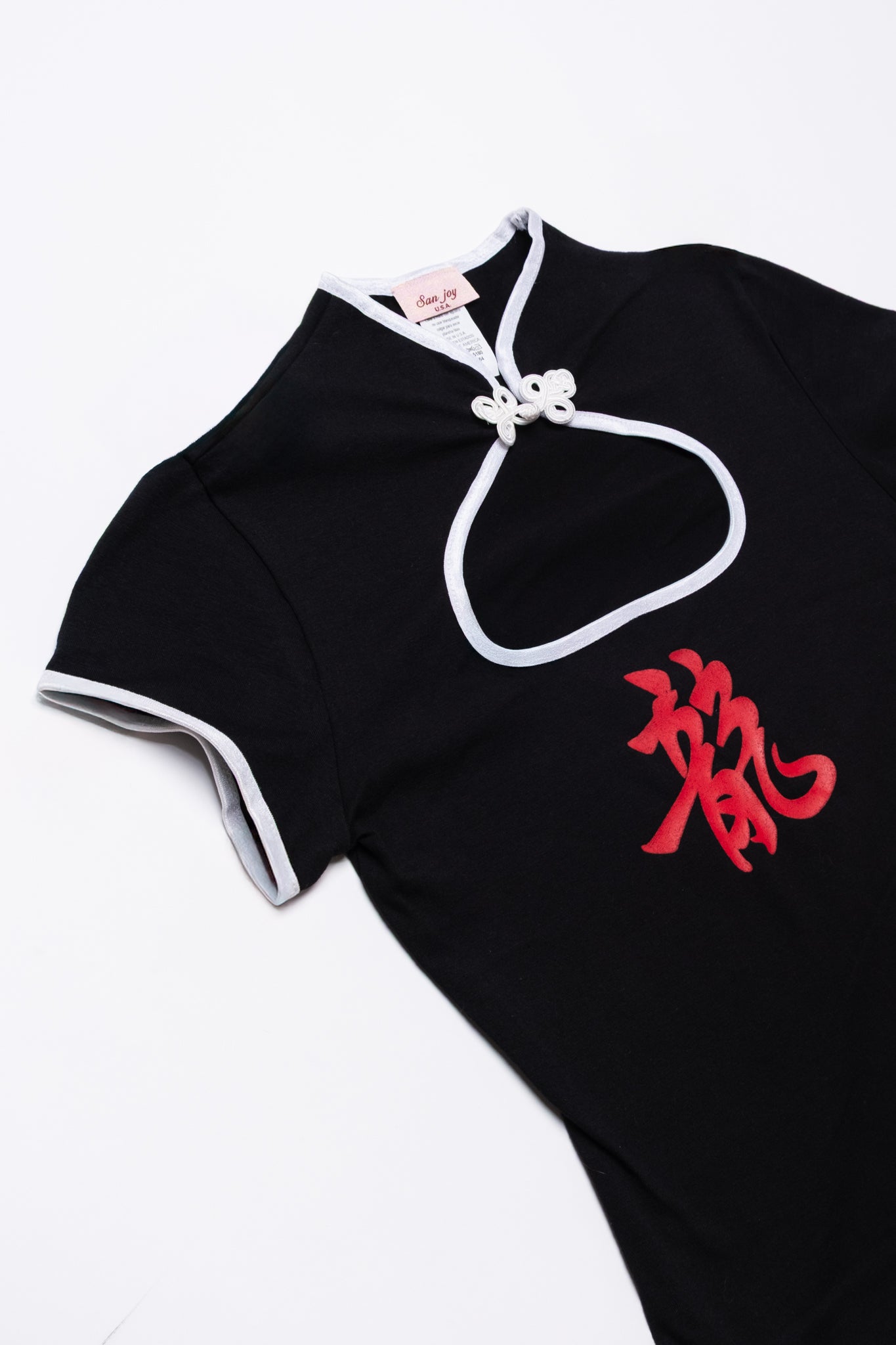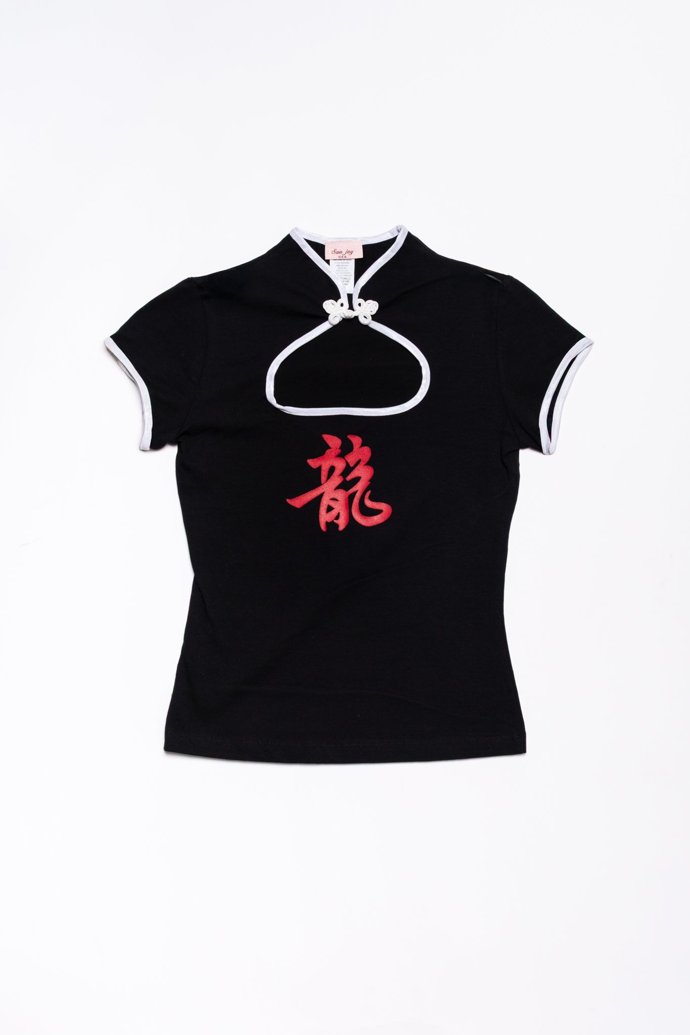 This black baby tee features a fitted silhouette with contrast white piping, a keyhole neckline with traditional frog closure detail, and a bold red 龙 (dragon) character graphic at the center.