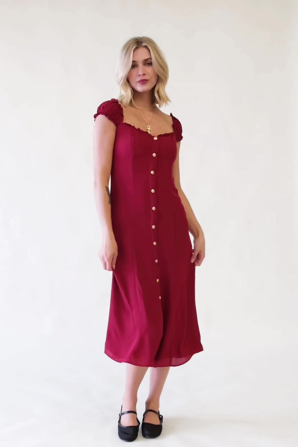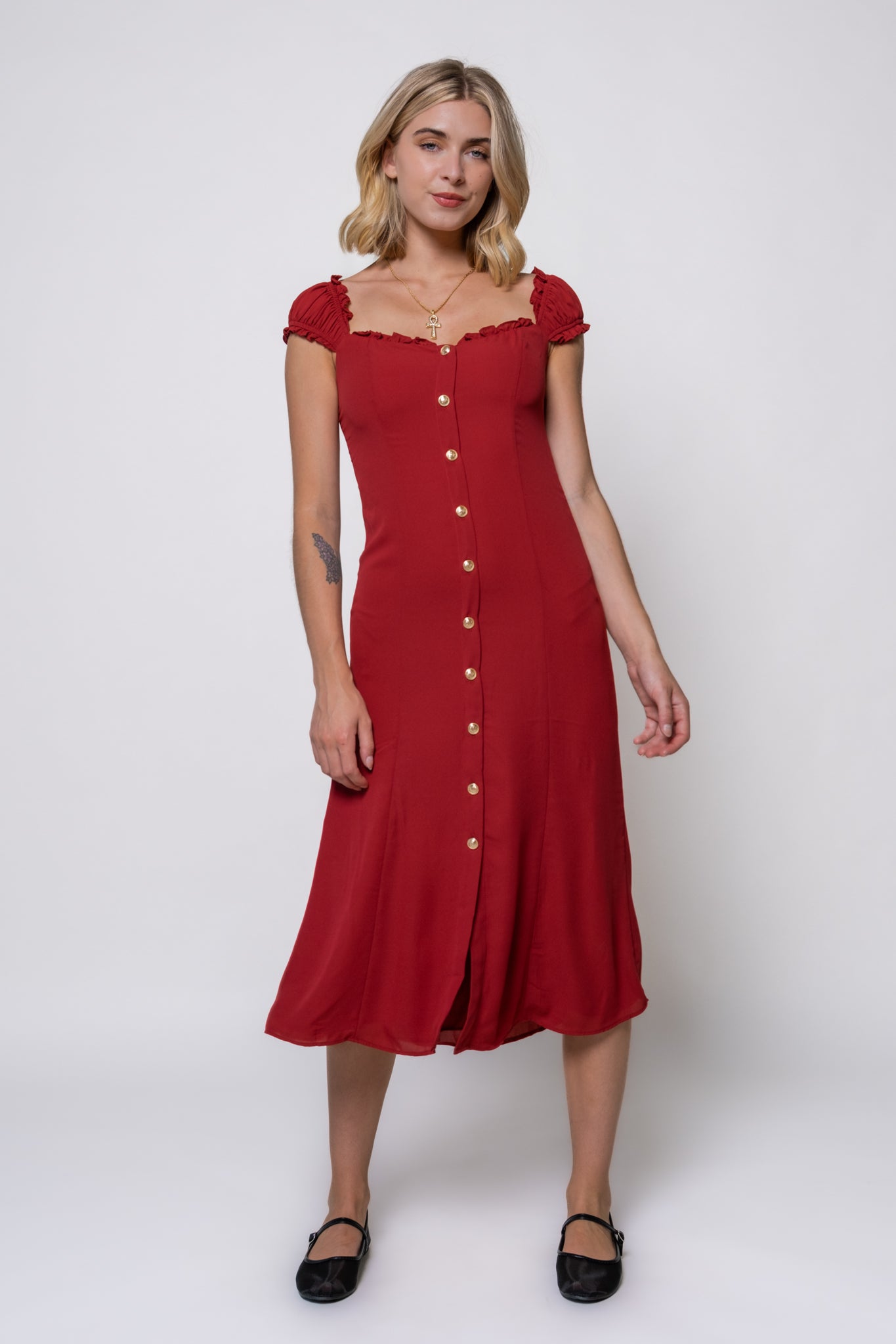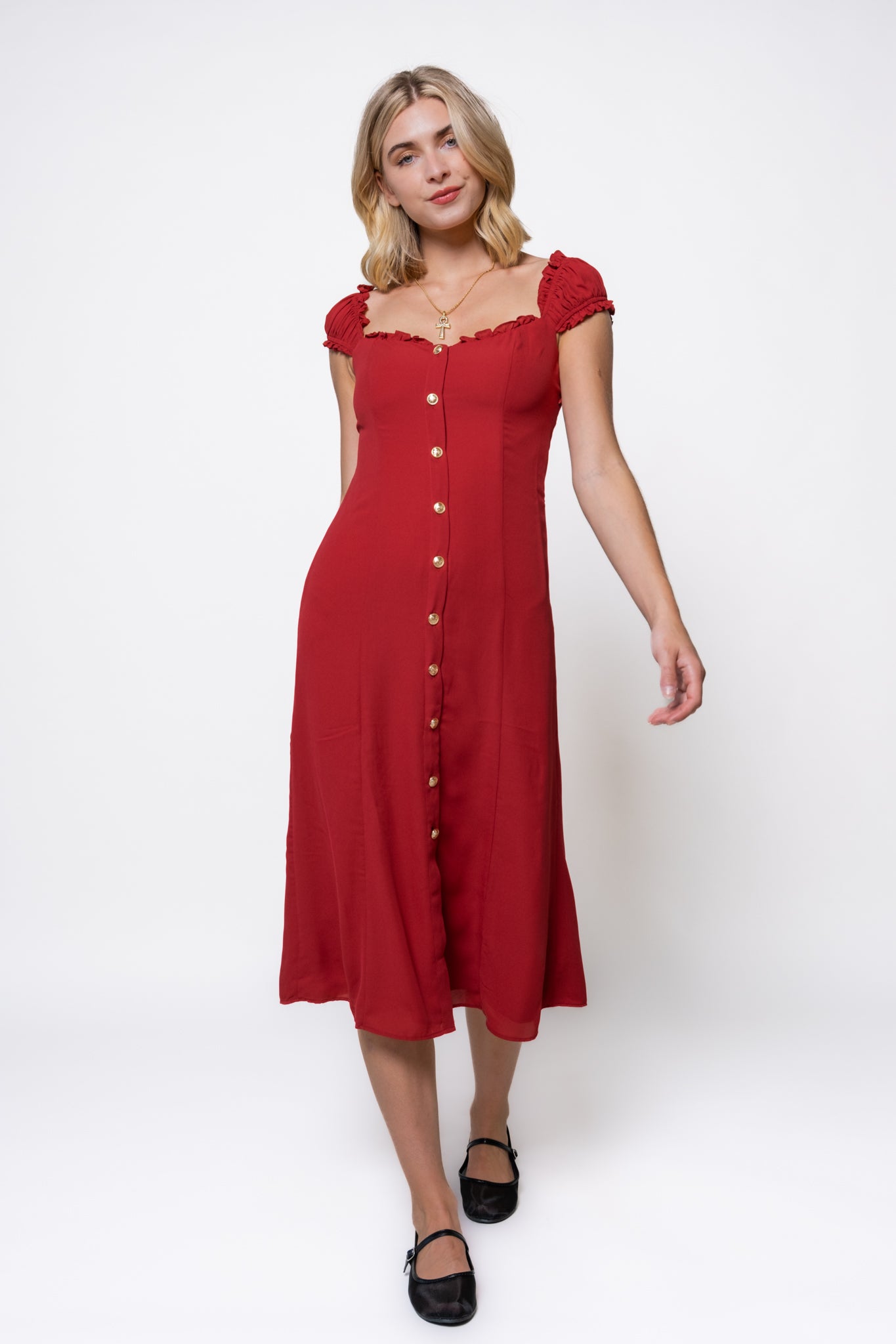 The Shiloh Midi Dress features a figure-skimming bodice with stretchy cap sleeves, sweetheart neckline, and gold button closure front. Stretchy panel and back tie detail provide the PERFECT fit!