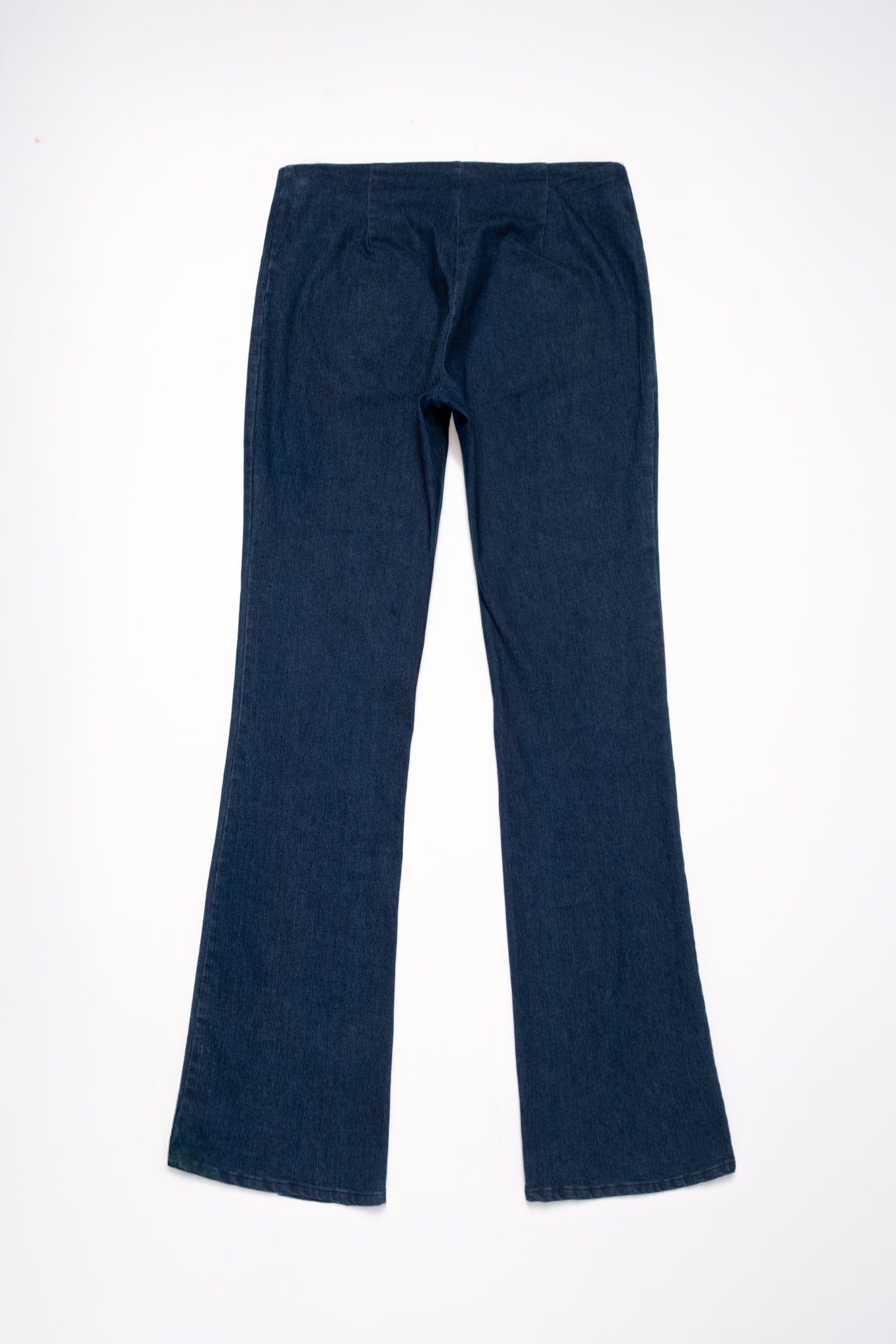 A sleek dark-wash flare with full-length zippers running down each leg--wear them closed for a clean line or unzip the hems for an instant kick-flare moment. Stretchy, comfy, and giving major early-2000's energy.