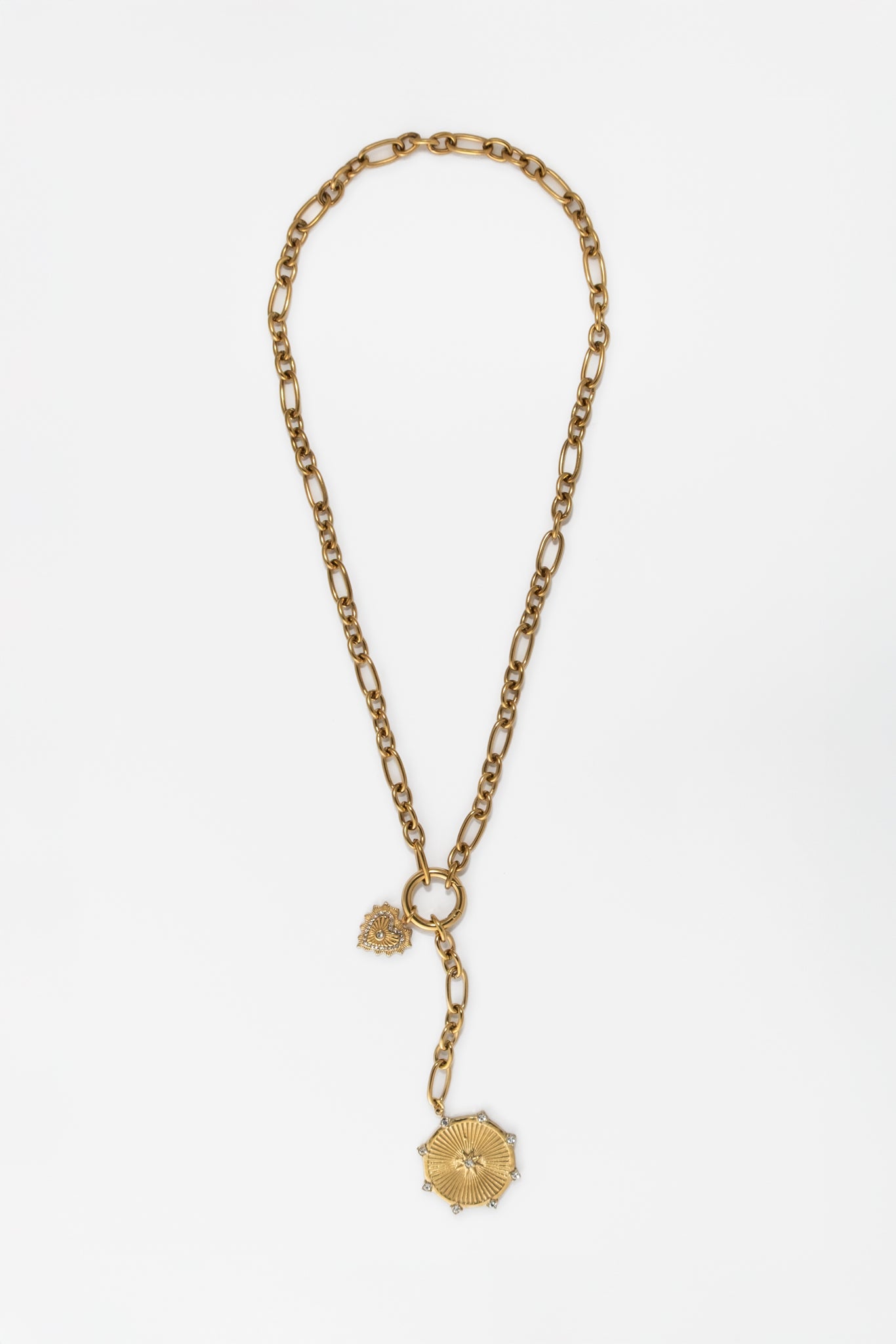 The Solara Necklace features a bold, vintage-inspired chain and a radiant sunburst pendant anchored by a smaller charm for the perfect balance.