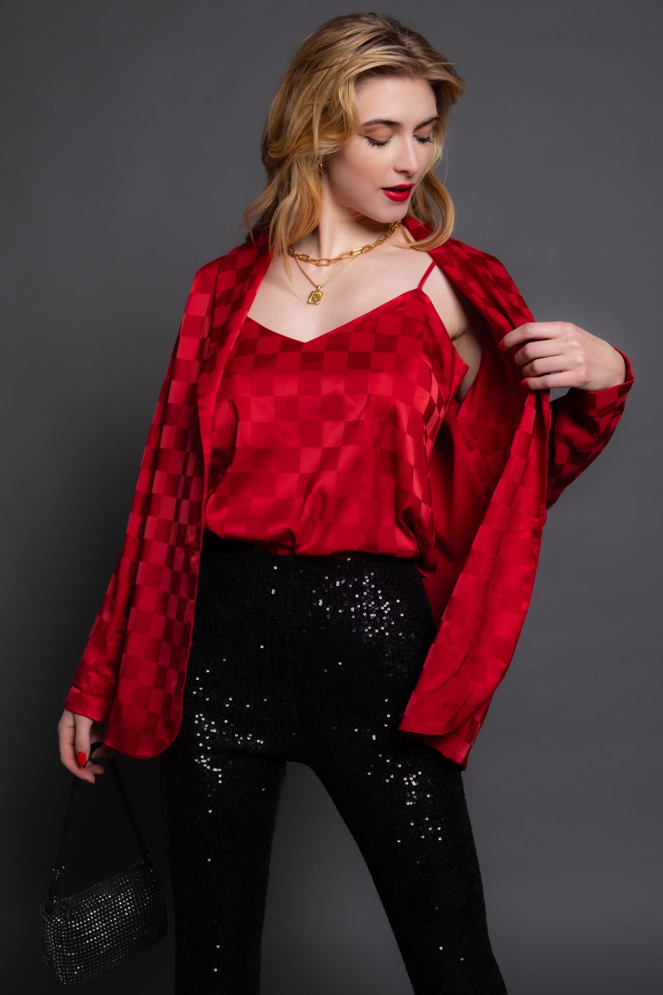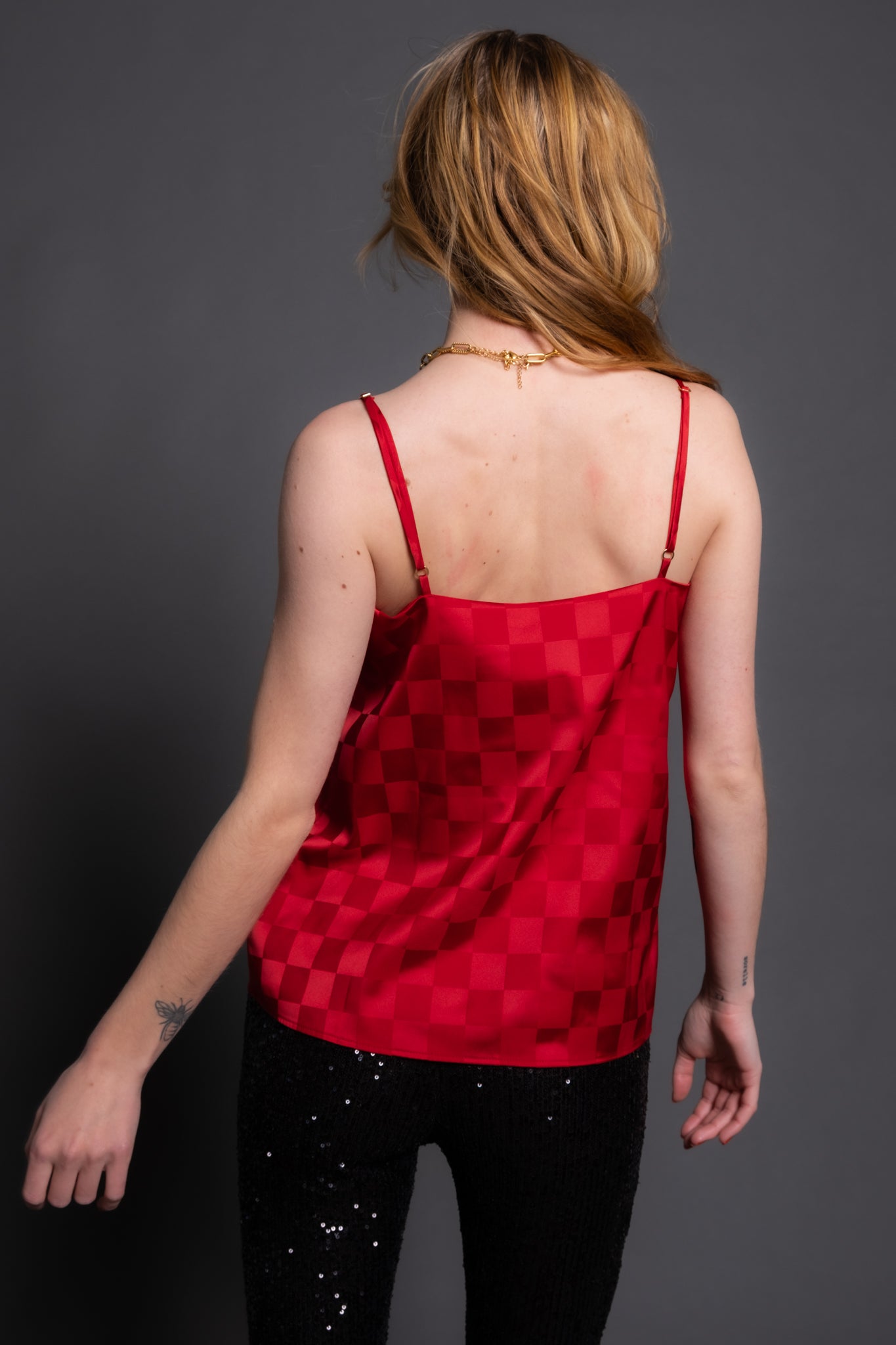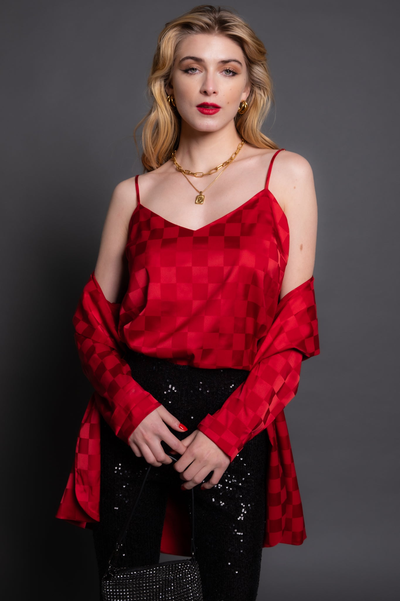 glam! Made in a stunning red woven check satin, this blousy fit cami features a relaxed fit and adjustable straps. Wear it solo or layer with the matching Felix Blazer for a chic & comfy party fit!