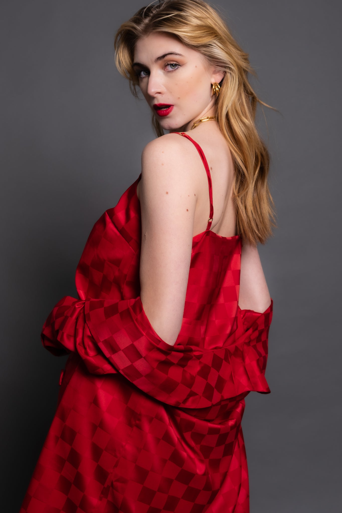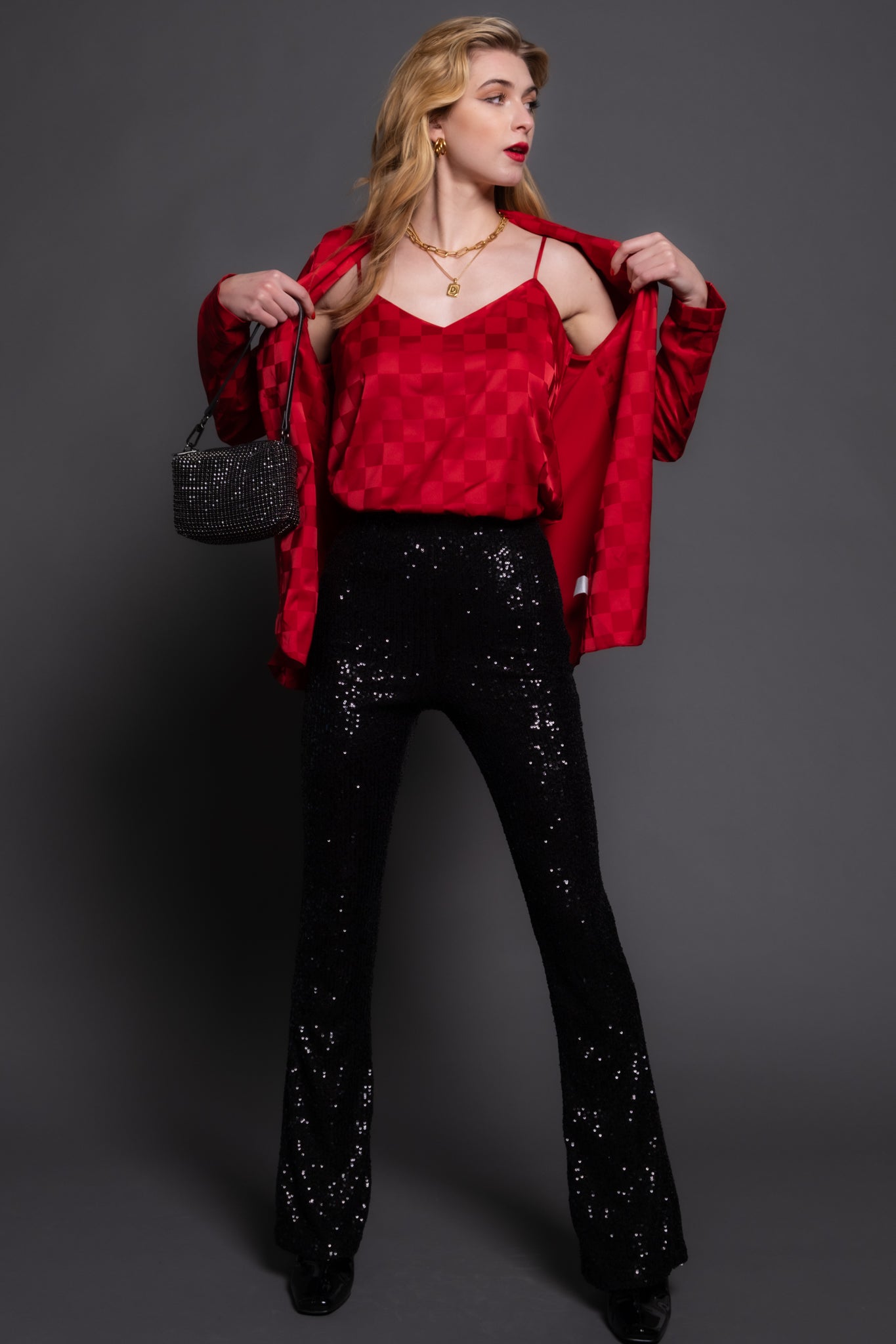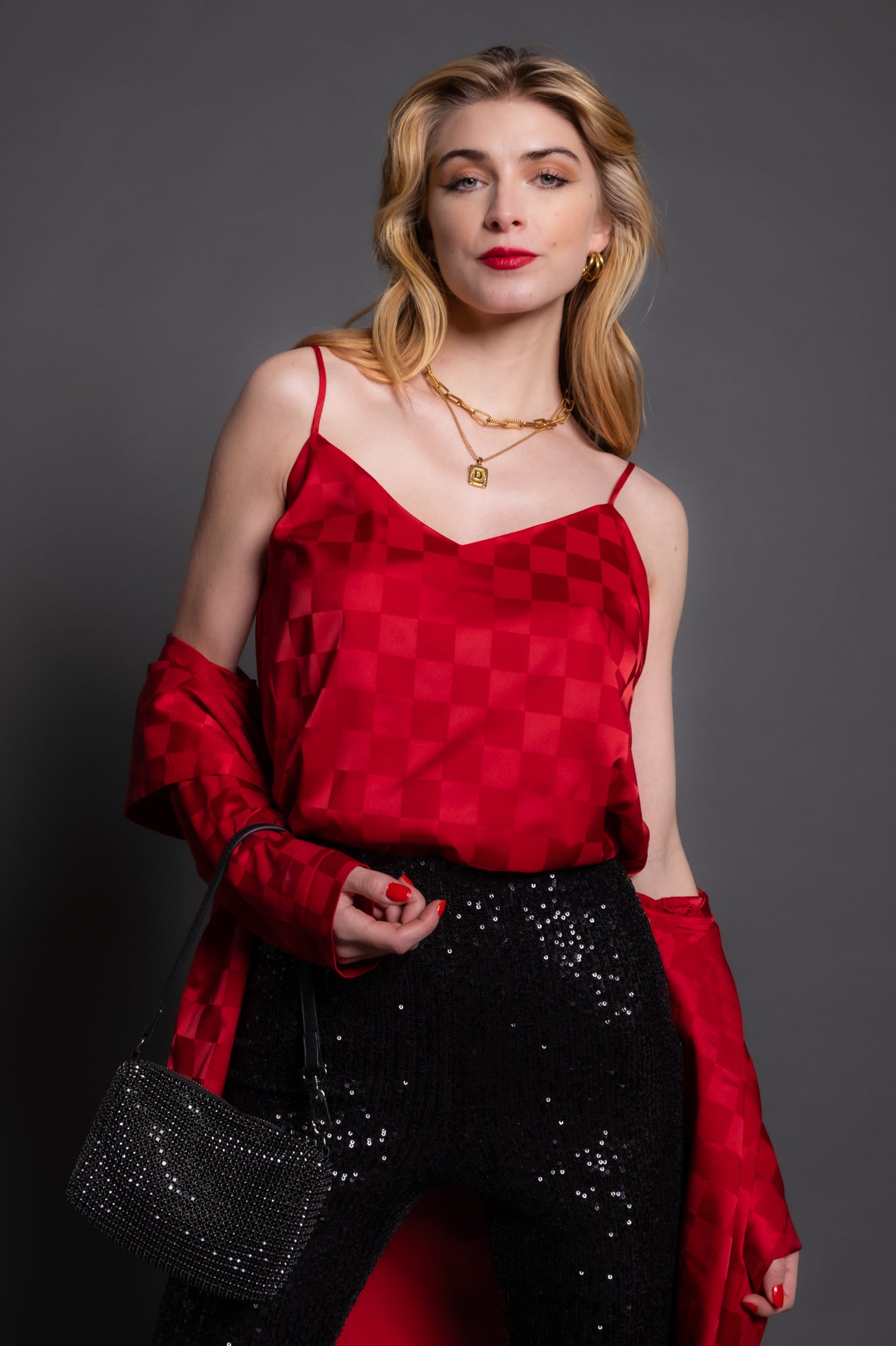 glam! Made in a stunning red woven check satin, this blousy fit cami features a relaxed fit and adjustable straps. Wear it solo or layer with the matching Felix Blazer for a chic & comfy party fit!