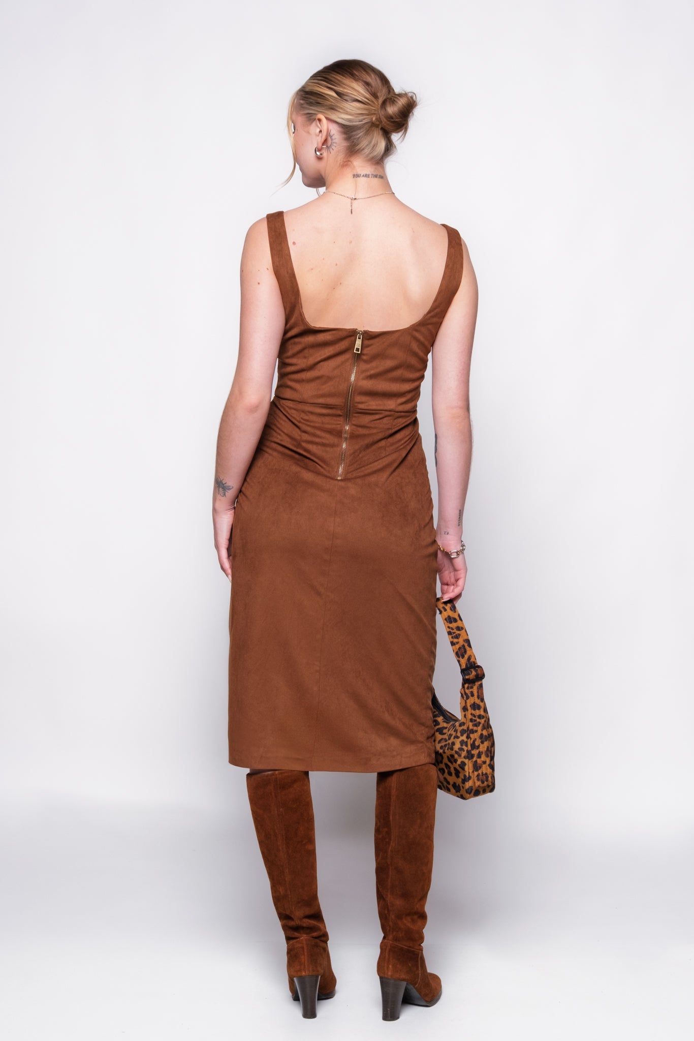 The Steve Madden Milo Dress is sleek and sculpted with a soft suede-like finish. Featuring a square neckline, ruched waist detail, and a side slit, it's sleek enough for night and effortless enough for day.