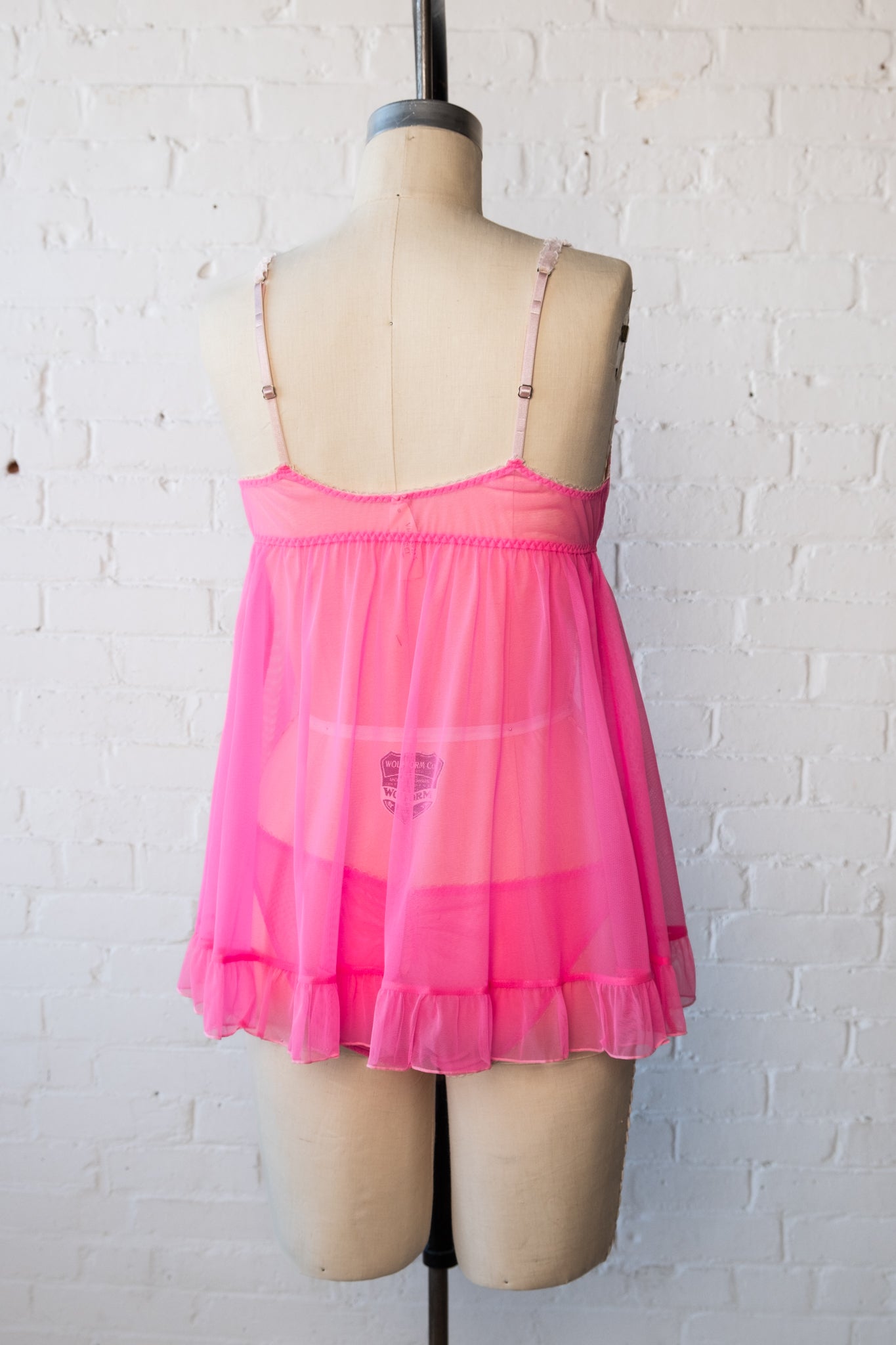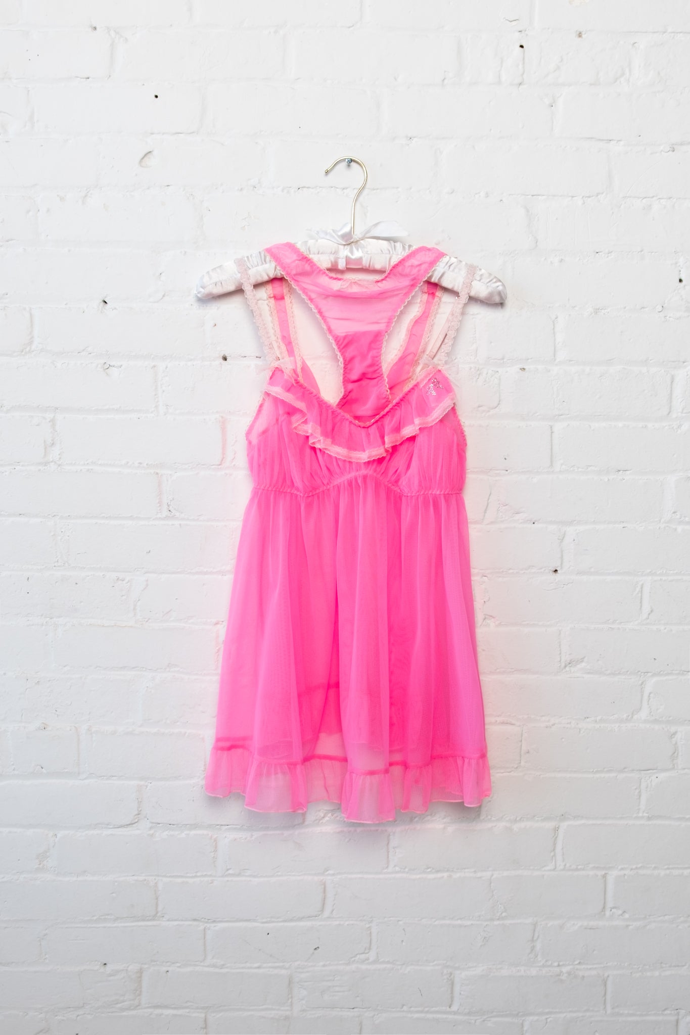 A sheer babydoll teddy with soft mesh, ruffle trim, and rhinestone bow detail. Comes with matching ruched panties.