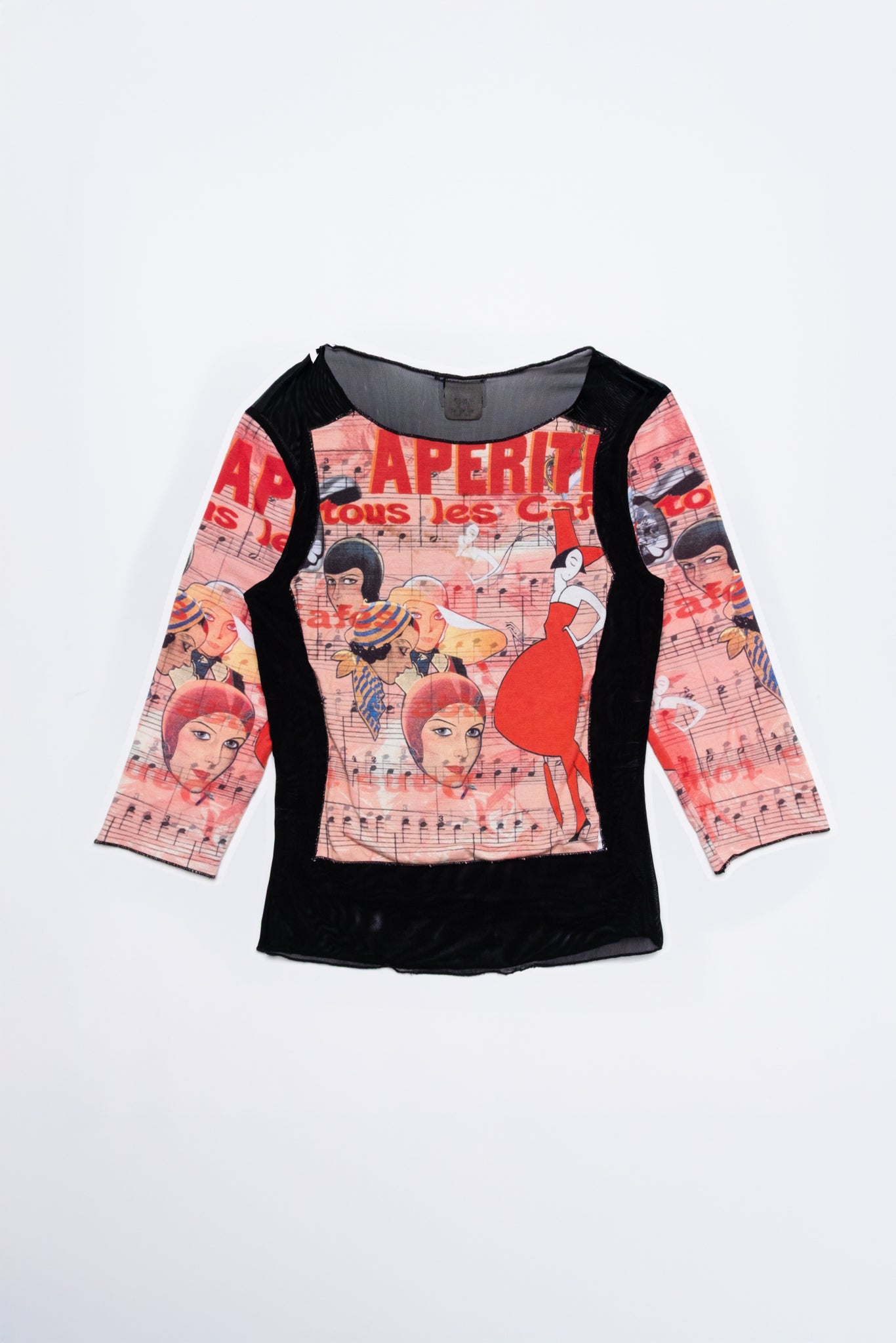 This CLIO mesh top features an all-over illustrated graphic print with bold red accents, sheer black mesh panels, and a stretchy fitted silhouette.