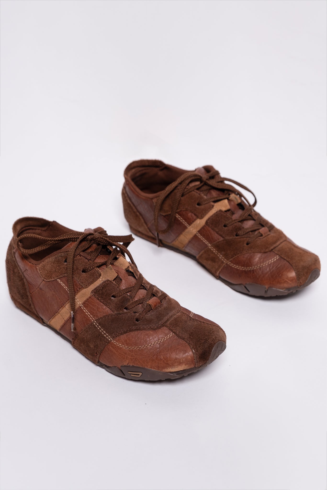 Low-profile and effortlessly cool, these early-2000s Diesel sneakers bring back that iconic racing-inspired silhouette. Made with patchwork leather and suede overlays in warm chocolate brown, they feature signature Diesel stitching, tonal laces, and the classic “D” heel tab.