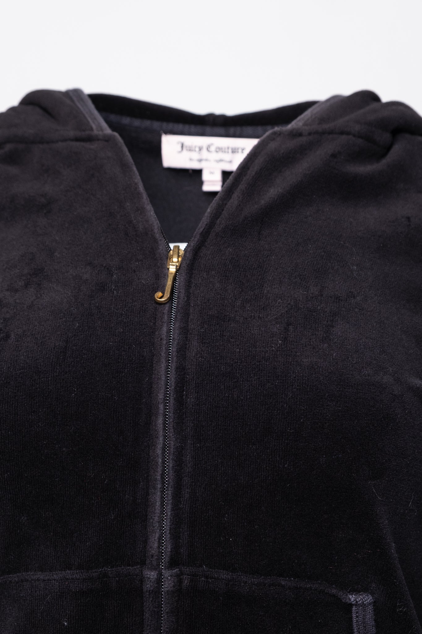 Mid-Late 2000s black velour Juicy hoodie with an ornate metallic crest graphic and subtle rhinestone detailing across the back. Fitted silhouette with front pockets and full zip closure.