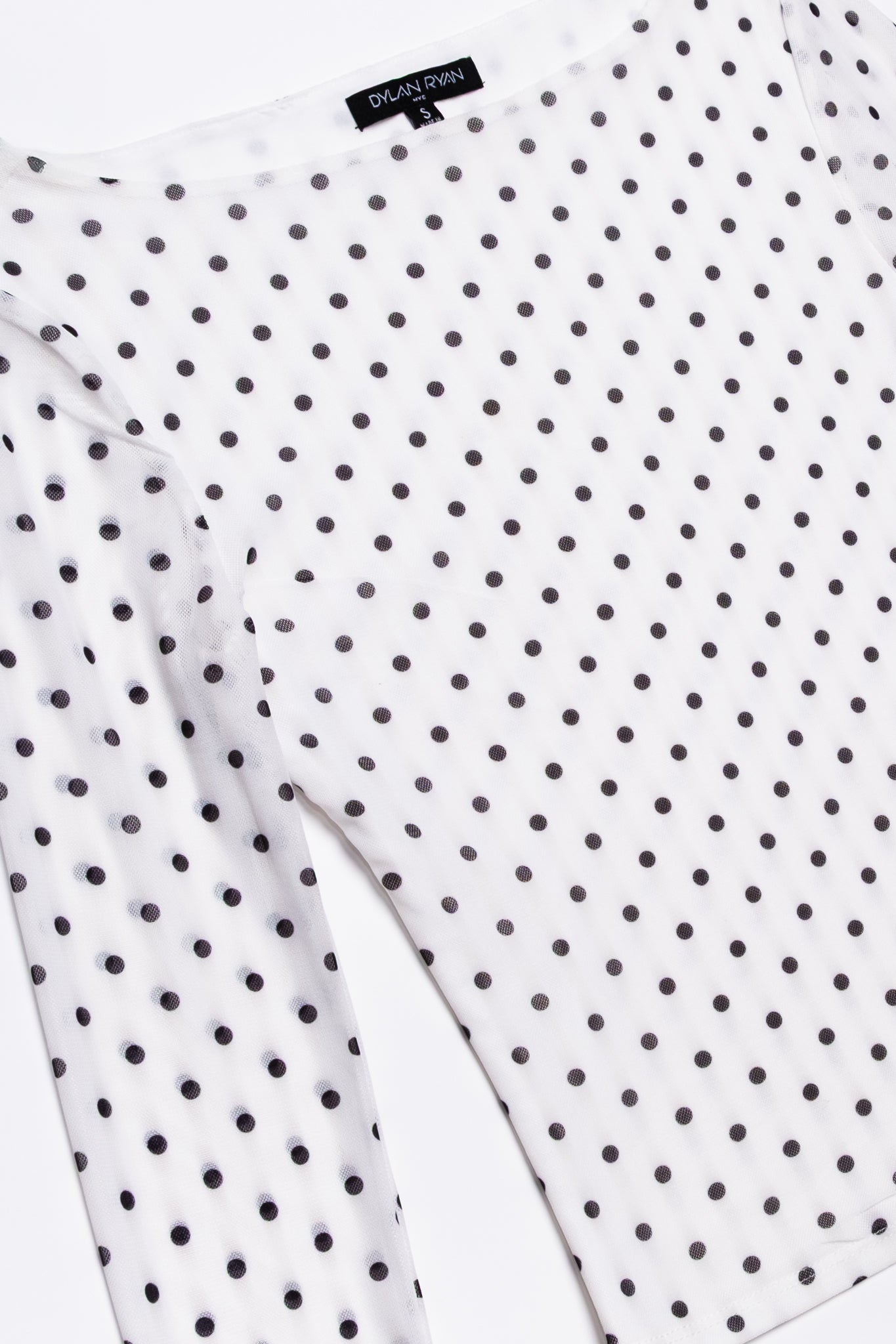 This Dylan Ryan features an all-over black polka-dot print on a soft white stretchy mesh. Designed with a sleek bateau neckline and long sheer sleeves, it pairs perfectly with everything from slip skirts to slouchy cargos!