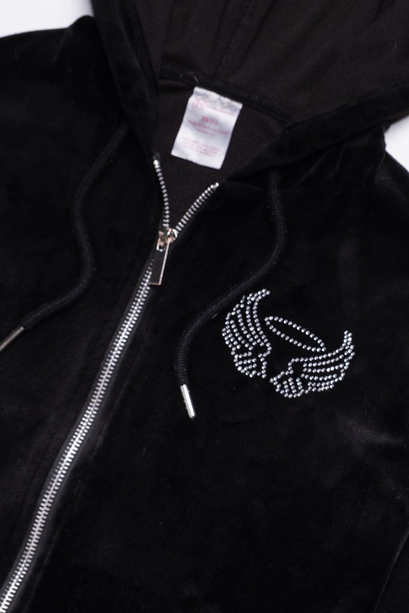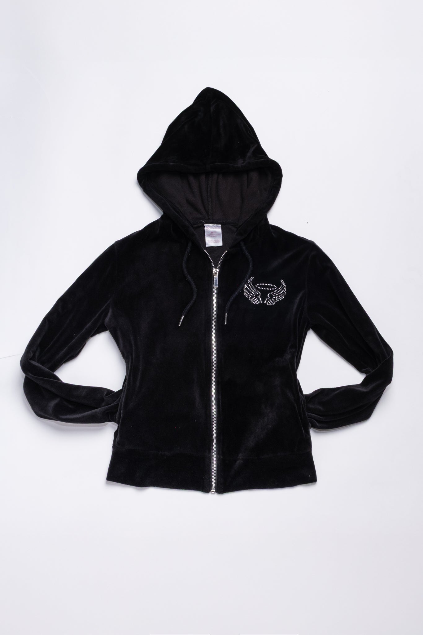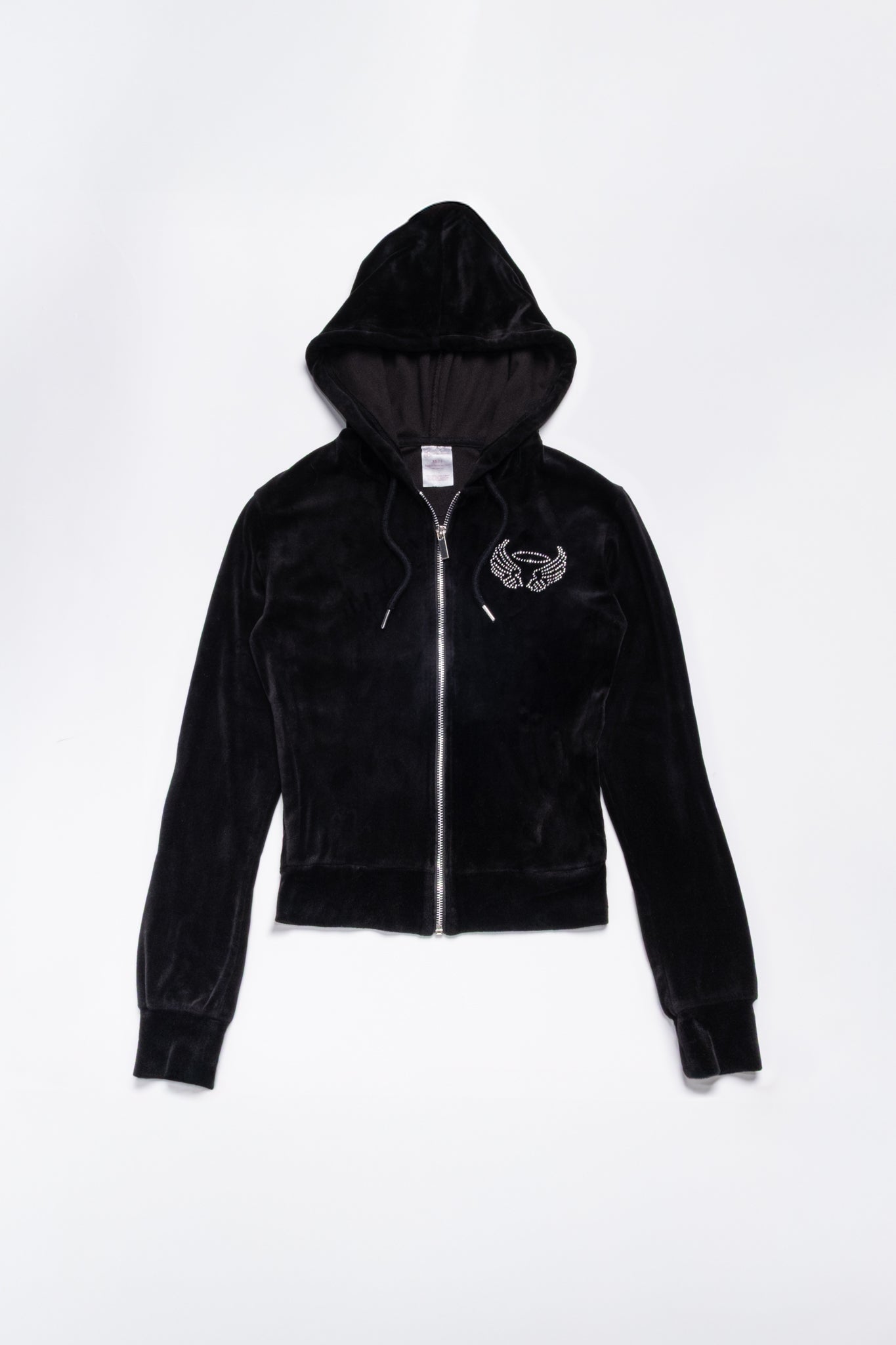 Vintage No Boundaries velour zip-up hoodie in jet black with rhinestone angel wing applique at the chest for that classic Y2K glam moment. Soft plush feel with fitted silhouette and full zip front—perfect layered over baby tees or paired with low-rise denim and cargos.